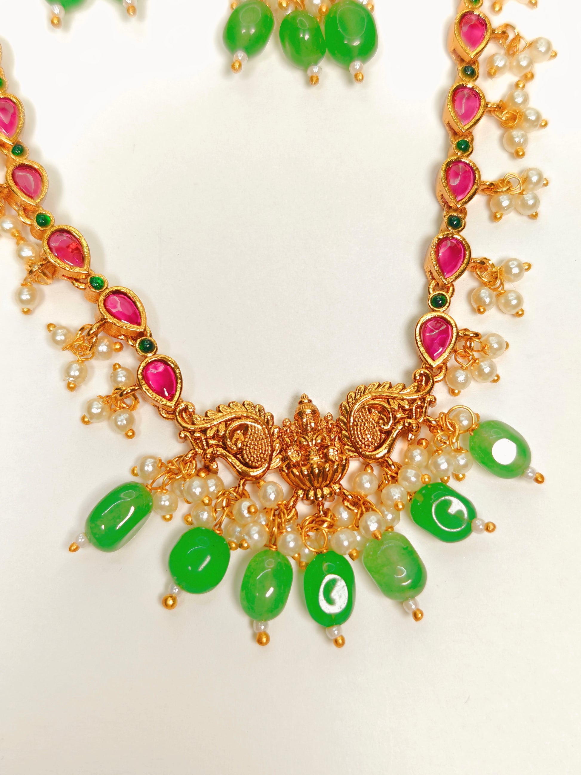 This Ambika Necklace Set features a striking gold-look finish adorned with elegant green & ruby pearls and ruby-colored stones. The centerpiece showcases a detailed goddess figure, symbolizing grace and divinity, which is beautifully echoed in the matching earrings. Perfect for adding a traditional yet sophisticated touch to any ensemble.