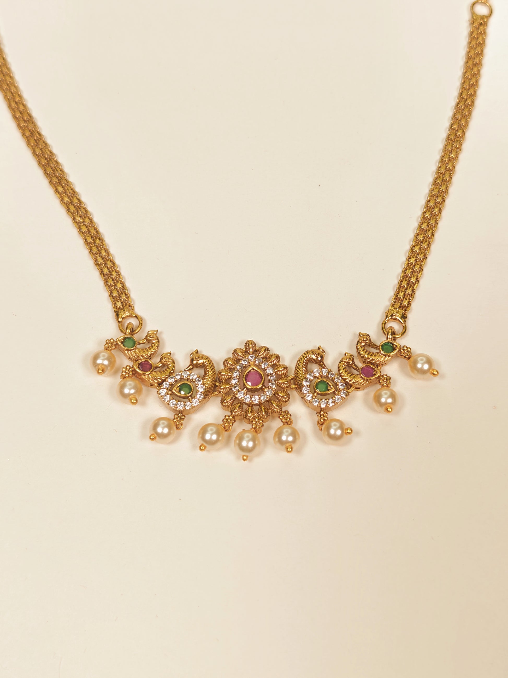 The Mayuri Choker Set is crafted from durable copper and alloy materials, offering a gold-look finish with a striking peacock design. This set will perfectly complement Indo-Western attire with a blend of traditional elegance and contemporary style. Ideal for enhancing your ensemble with lasting quality and intricate craftsmanship.