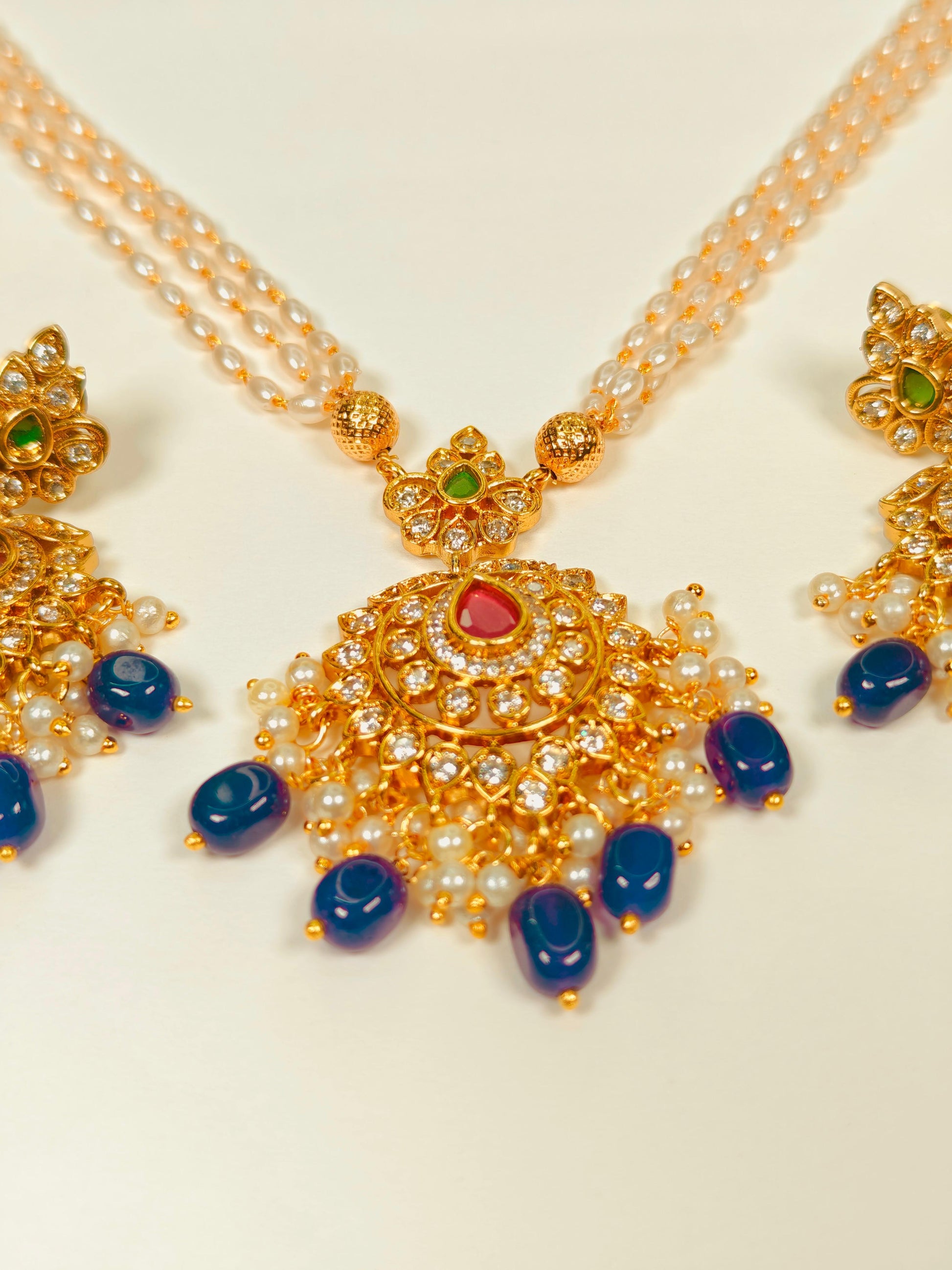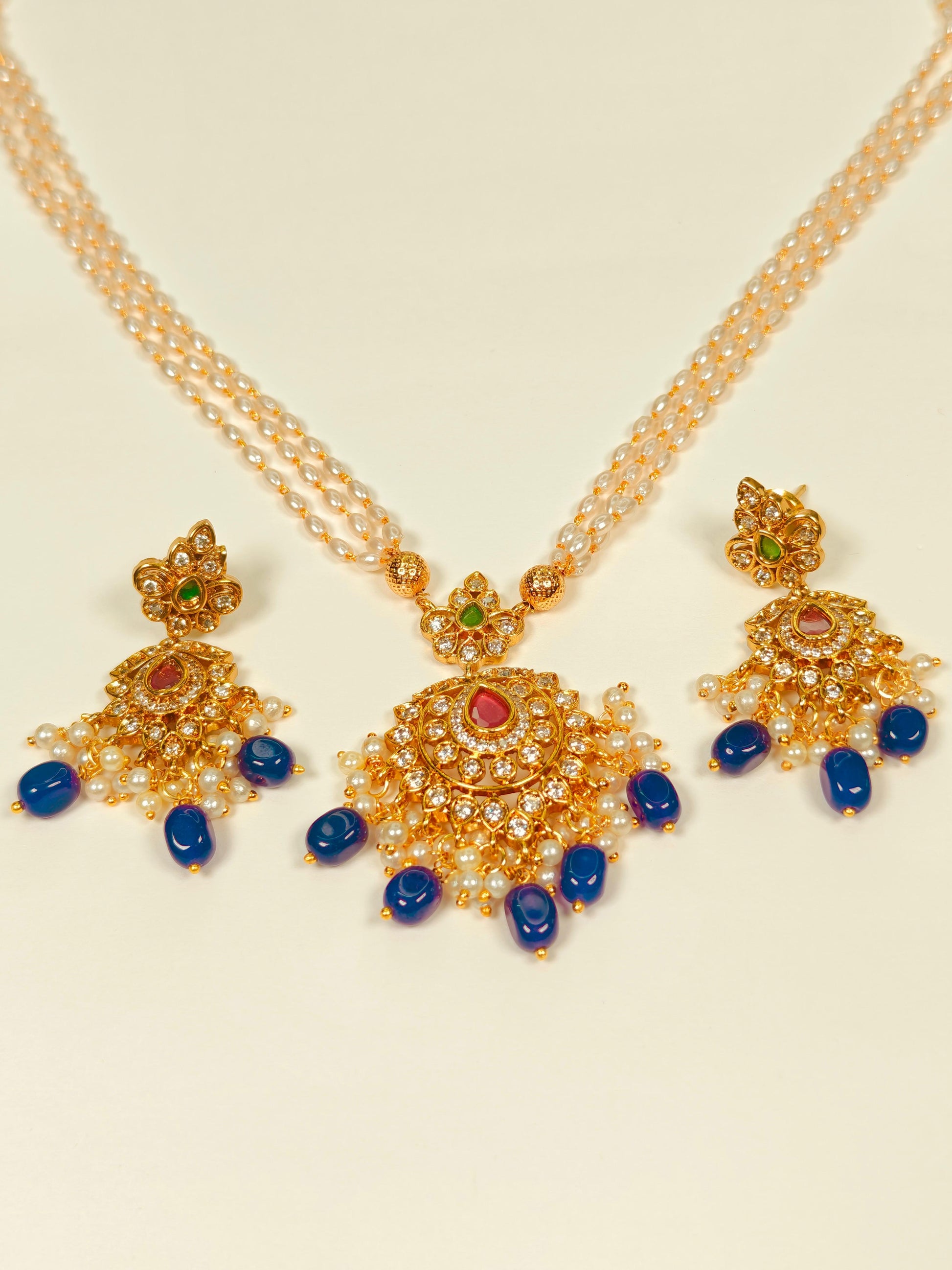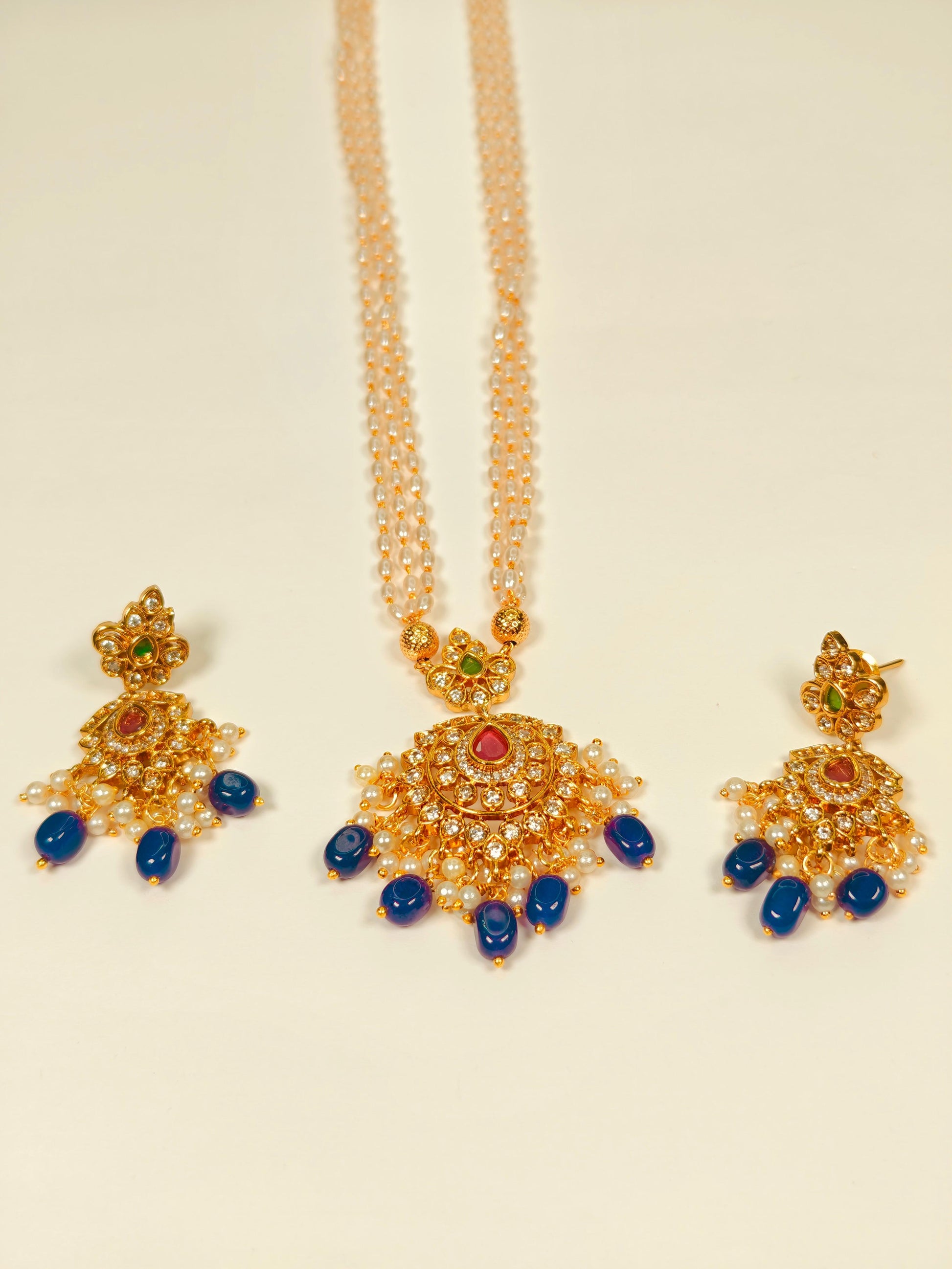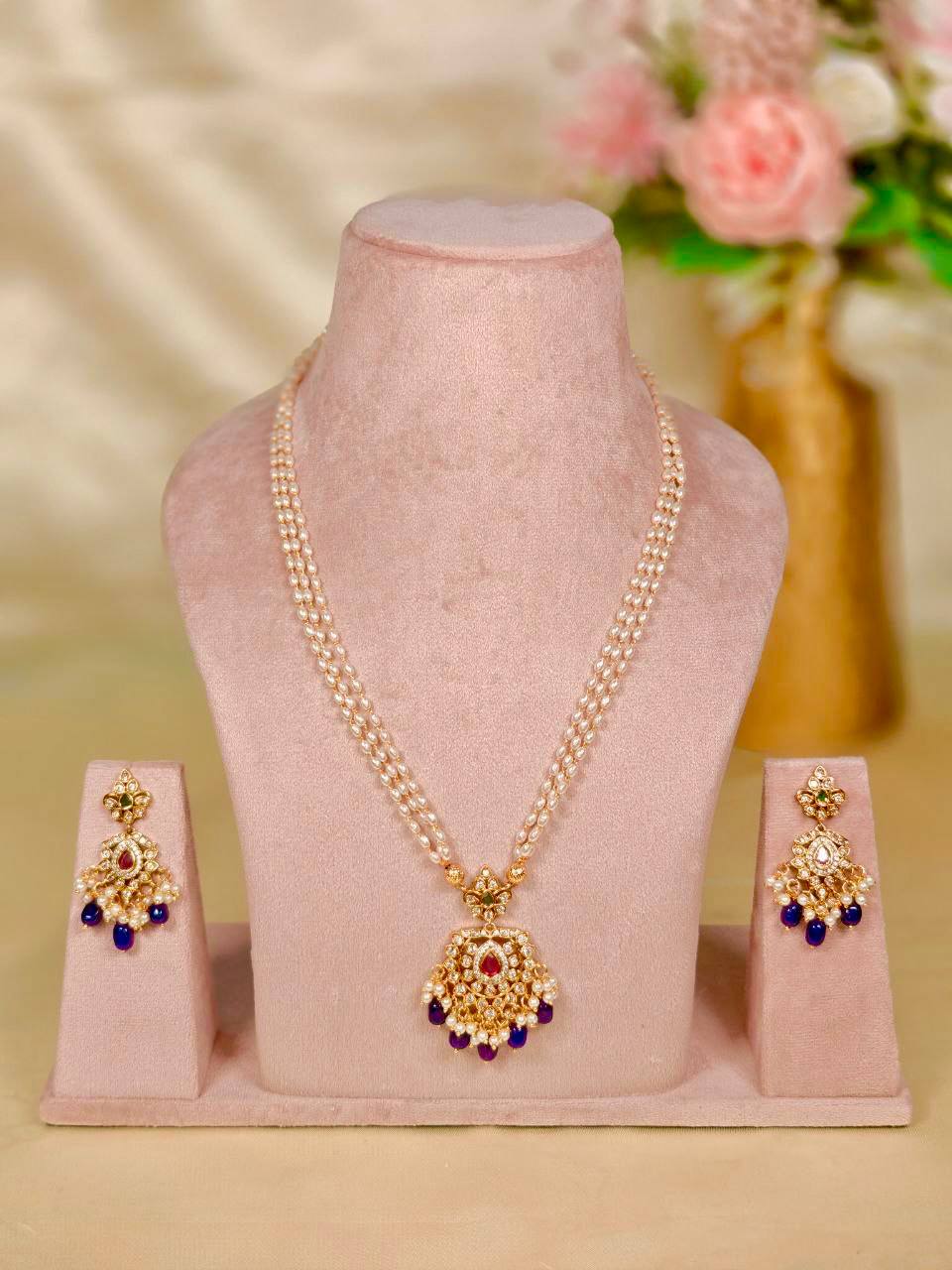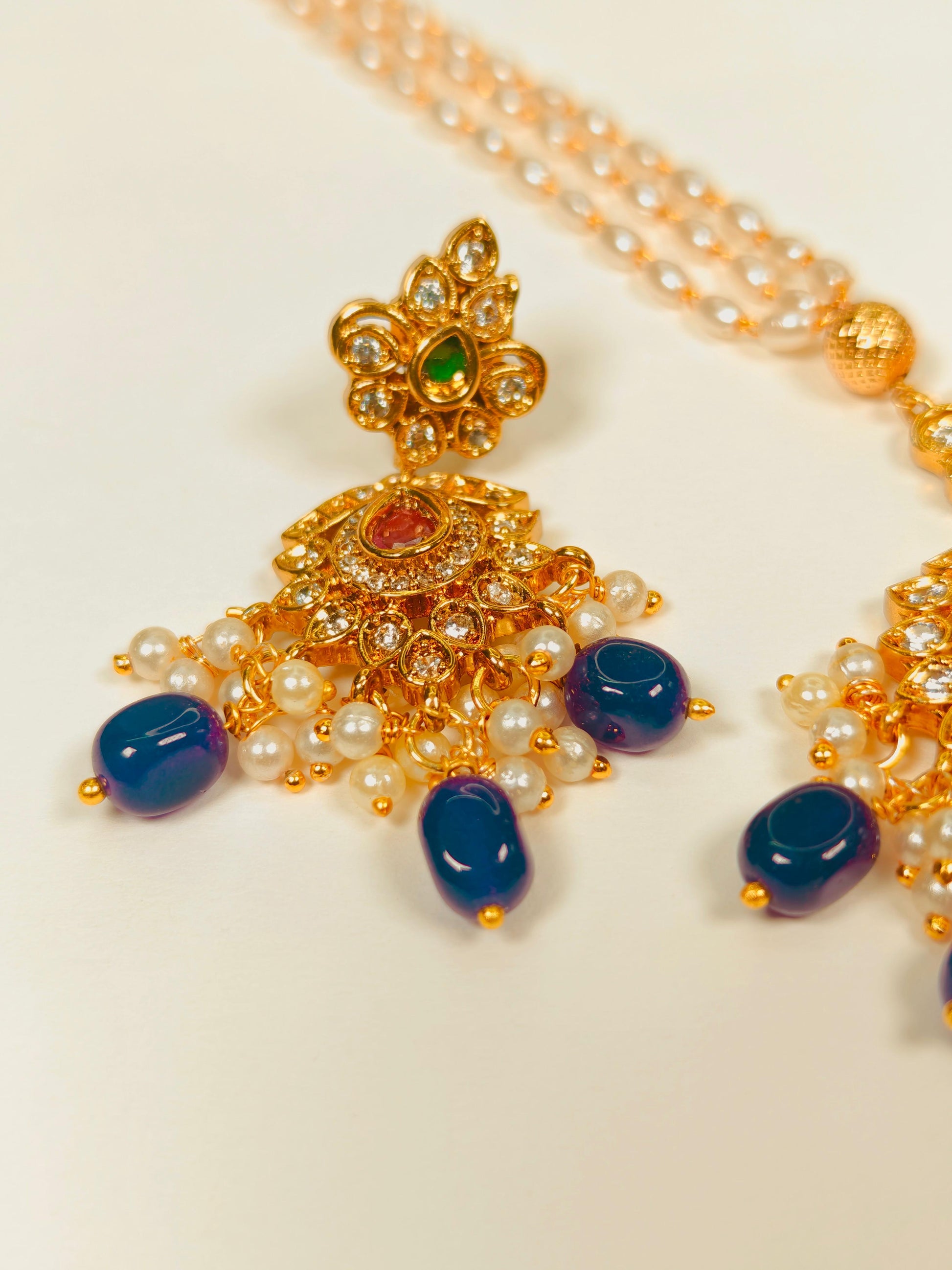 The Neel Devi Long Haram showcases a sophisticated design featuring radiant blue pearls set against a gold-toned finish. Expertly crafted from copper and alloy, this necklace combines durability with the luxurious appeal of traditional gold jewelry. Its elongated style enhances any outfit, making it an ideal accessory for formal occasions and cultural celebrations.