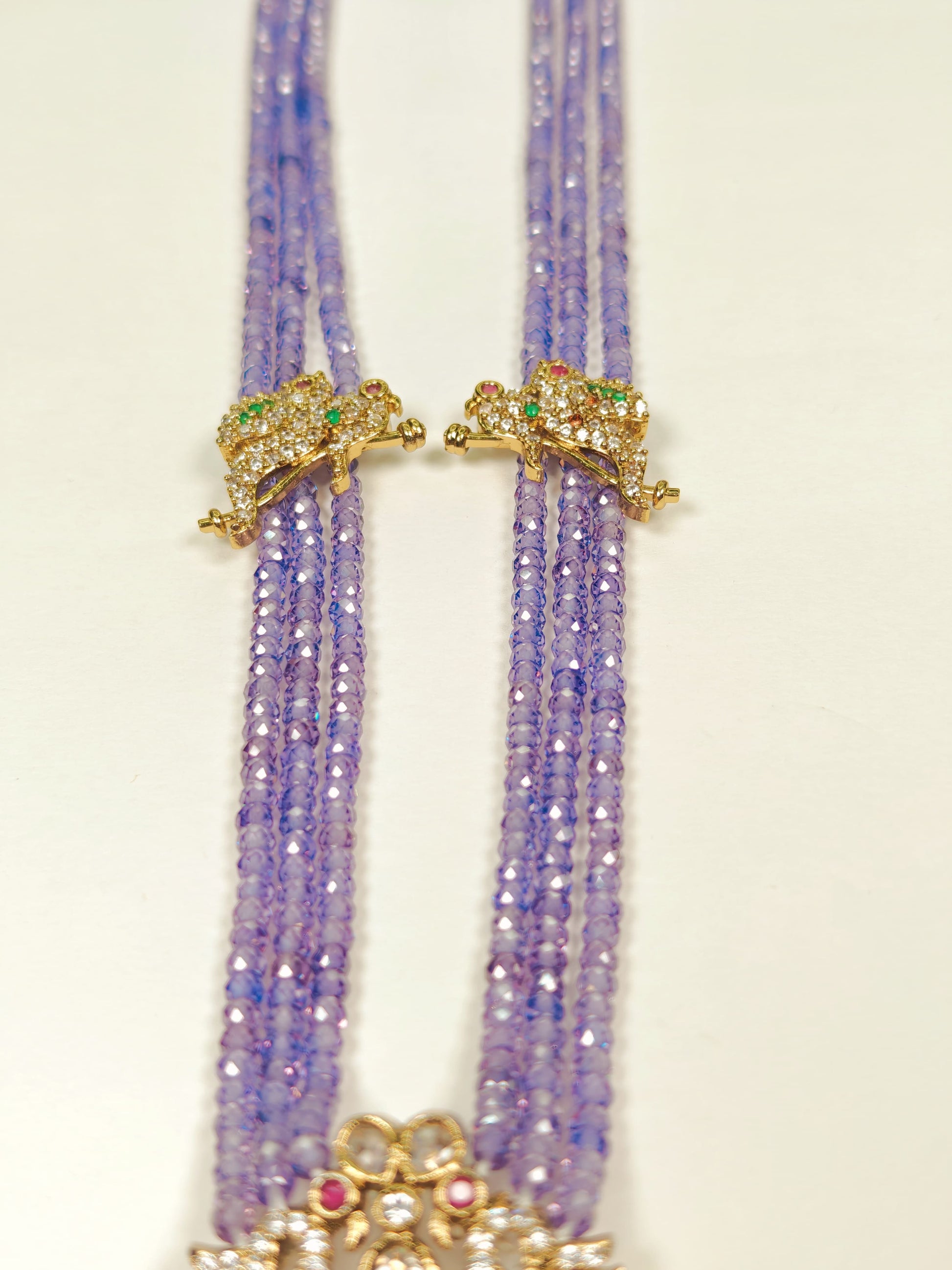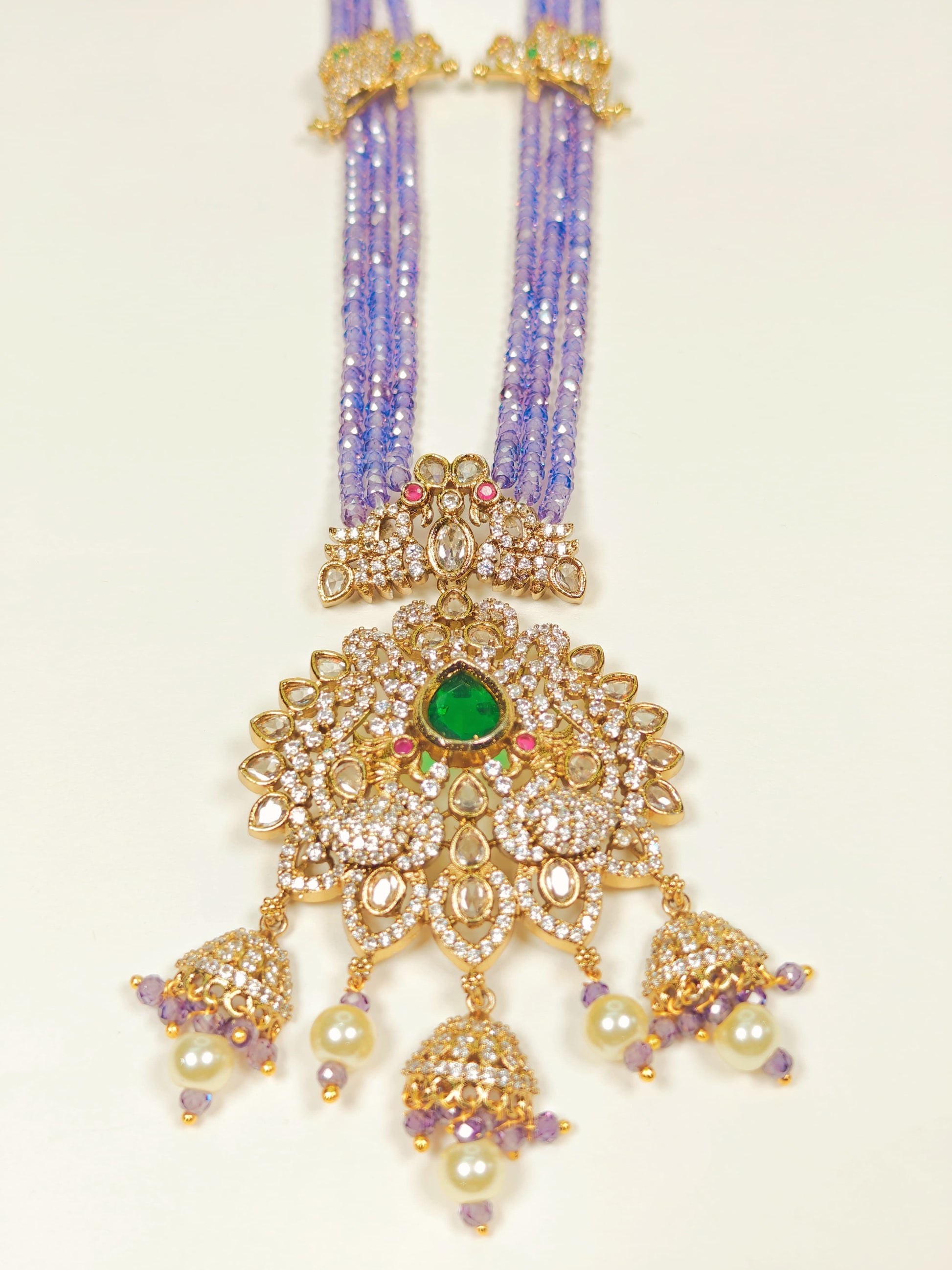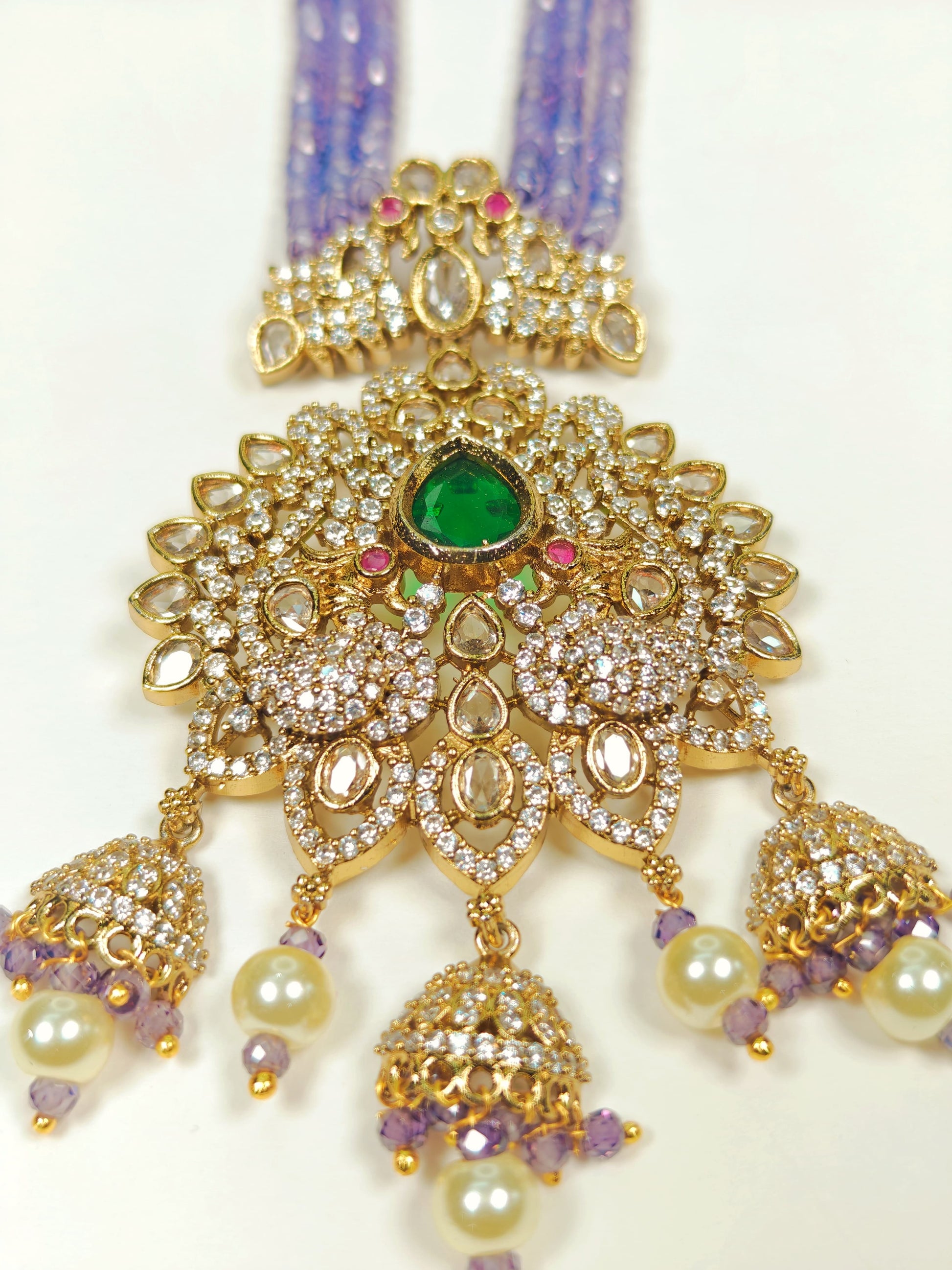 The Rukmani Long Haram is a sophisticated necklace featuring a harmonious combination of purple and white beads, expertly strung to create a balanced and elegant look. Its centerpiece is a large, intricately detailed pendant with a gold-look finish, adding a touch of grandeur and traditional charm. Designed for those who appreciate fine craftsmanship, this long necklace enhances any ethnic attire with its rich colors and ornate pendant, making it an ideal choice for festive occasions and celebrations.