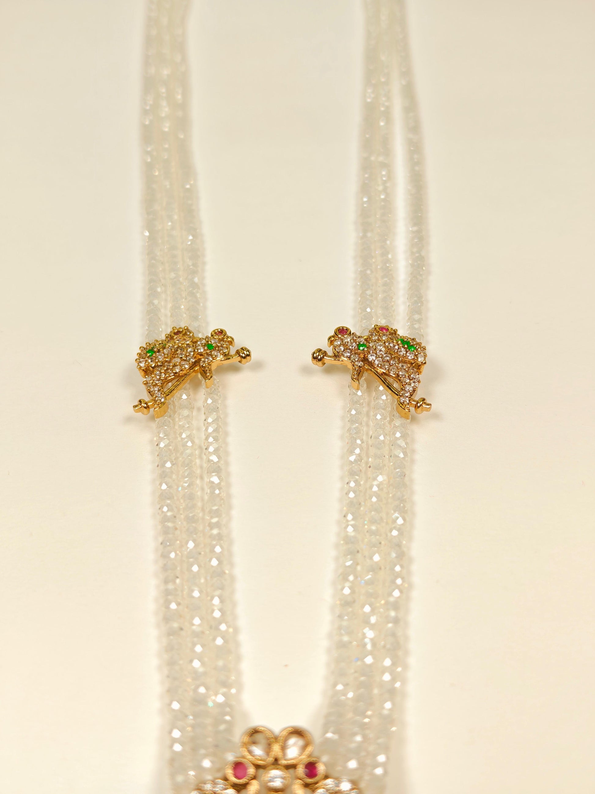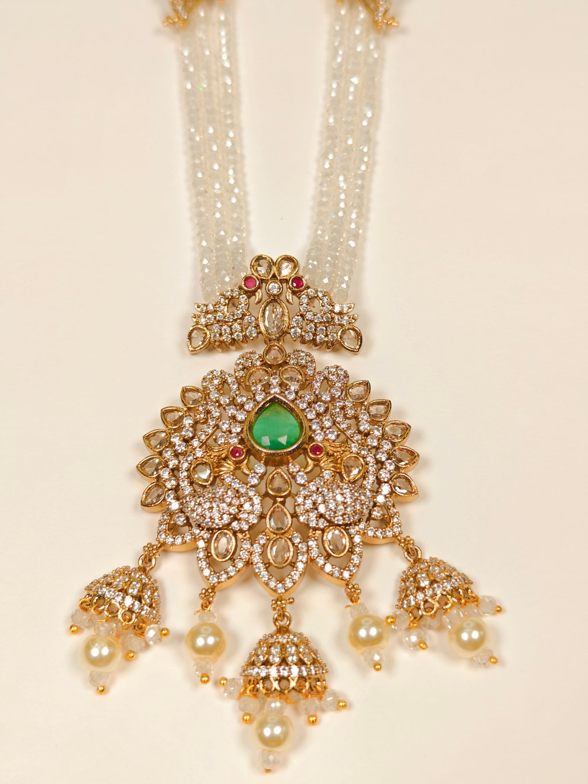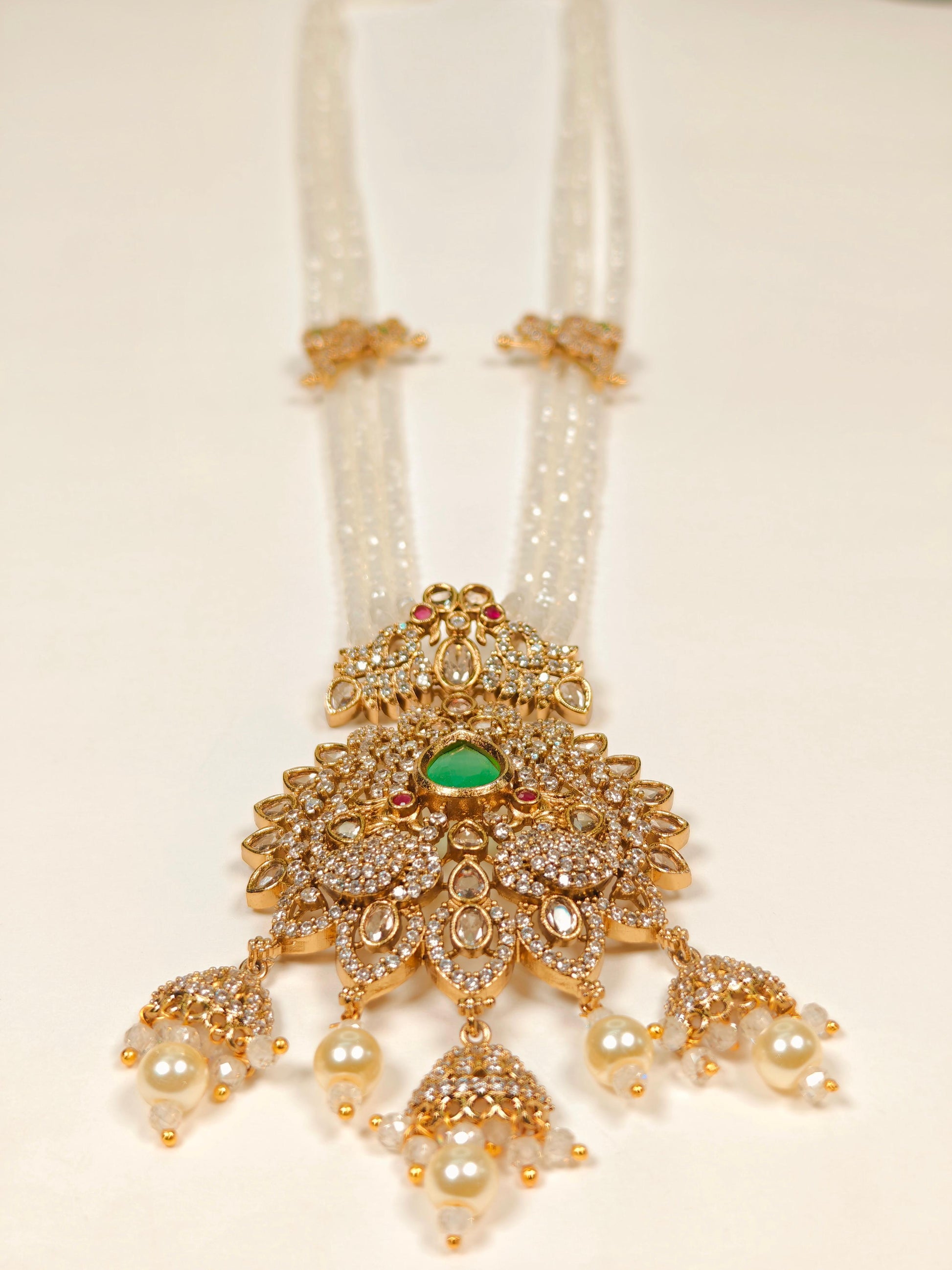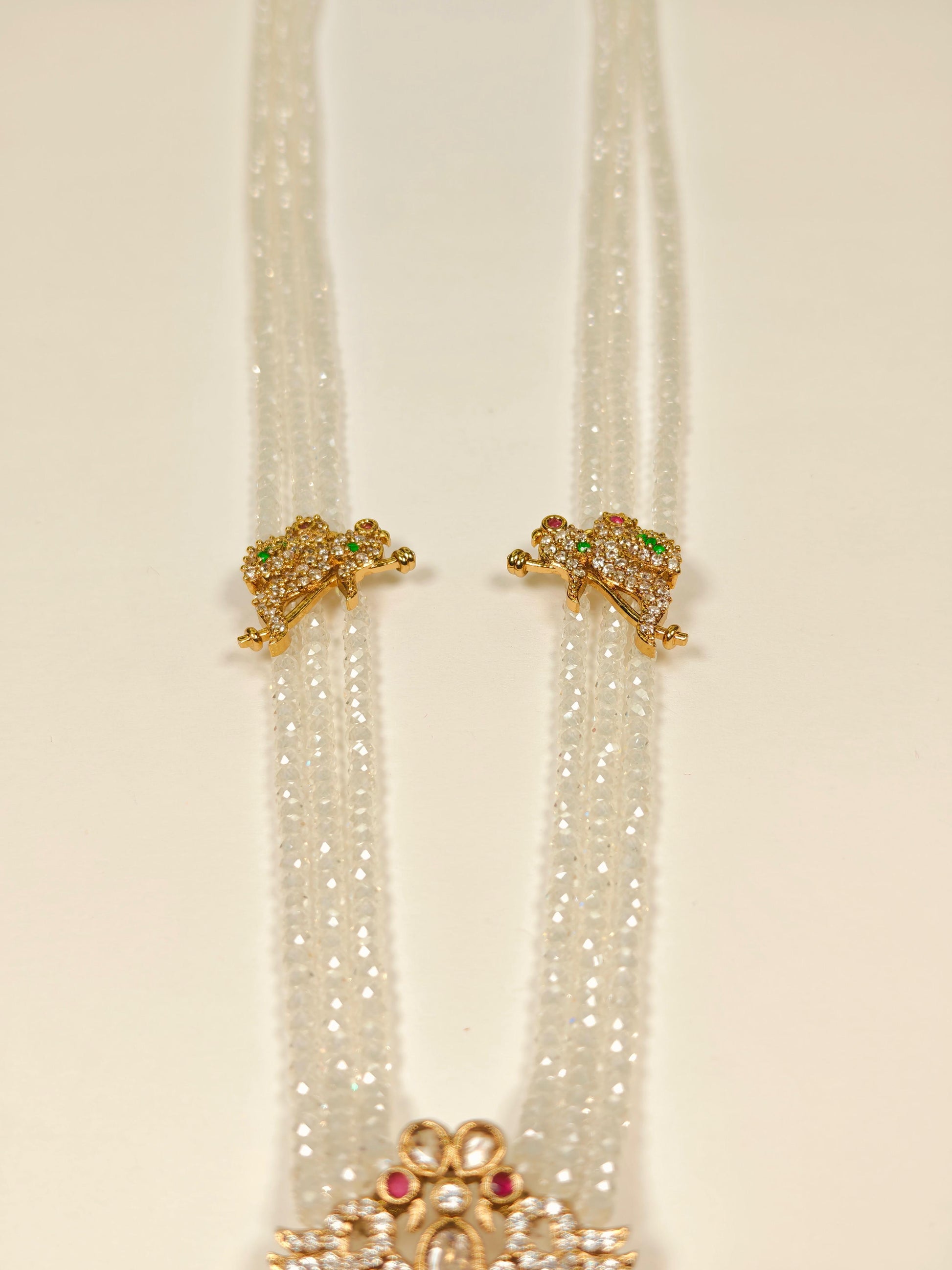 The Rukmani Long Haram is a sophisticated necklace featuring a harmonious combination of purple and white beads, expertly strung to create a balanced and elegant look. Its centerpiece is a large, intricately detailed pendant with a gold-look finish, adding a touch of grandeur and traditional charm. Designed for those who appreciate fine craftsmanship, this long necklace enhances any ethnic attire with its rich colors and ornate pendant, making it an ideal choice for festive occasions and celebrations.
