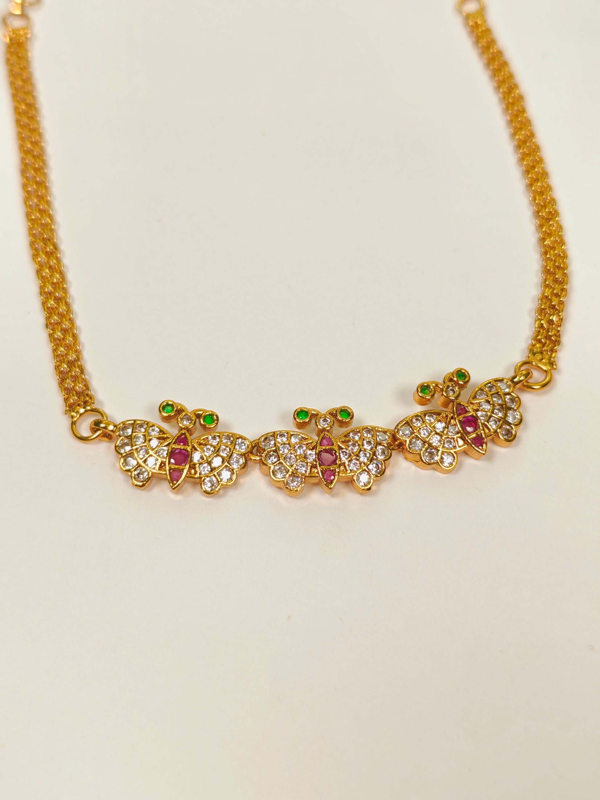 Crafted from copper and alloy with a lustrous gold finish, the Teen Titli Choker Set showcases intricate pearl and stone detailing. The design features three delicate butterfly accents that bring a graceful and sophisticated charm to the piece. This choker offers a perfect blend of artistry and durability, making it an ideal accessory for those seeking refined elegance in their jewelry collection.