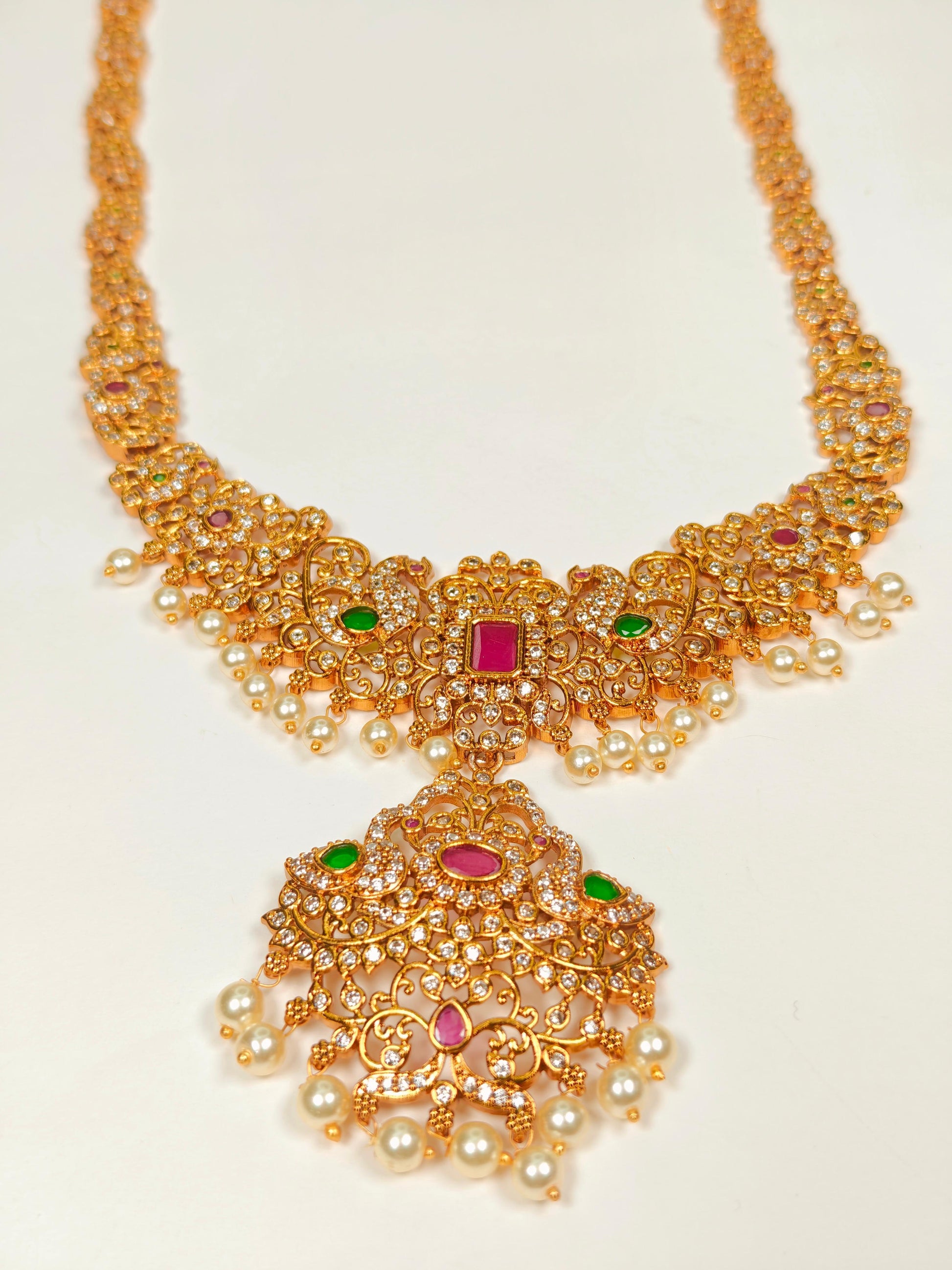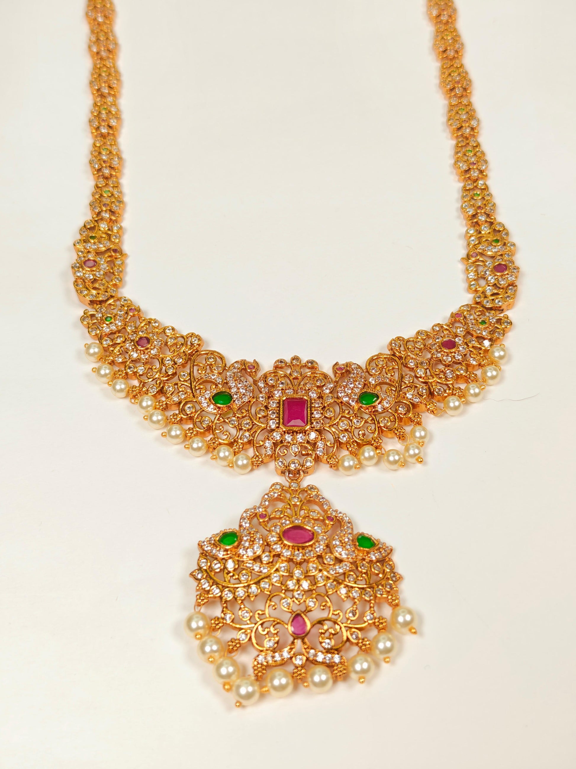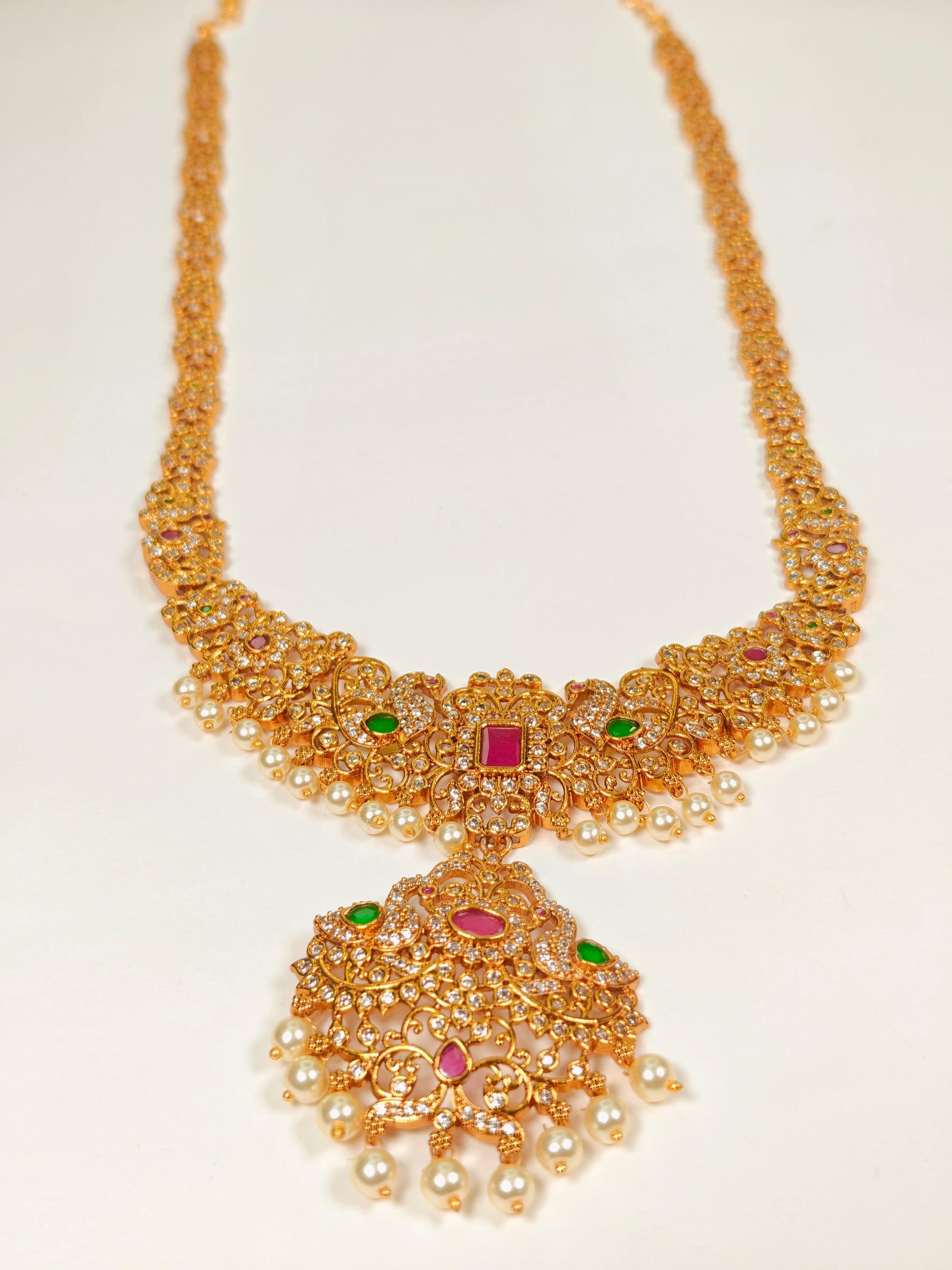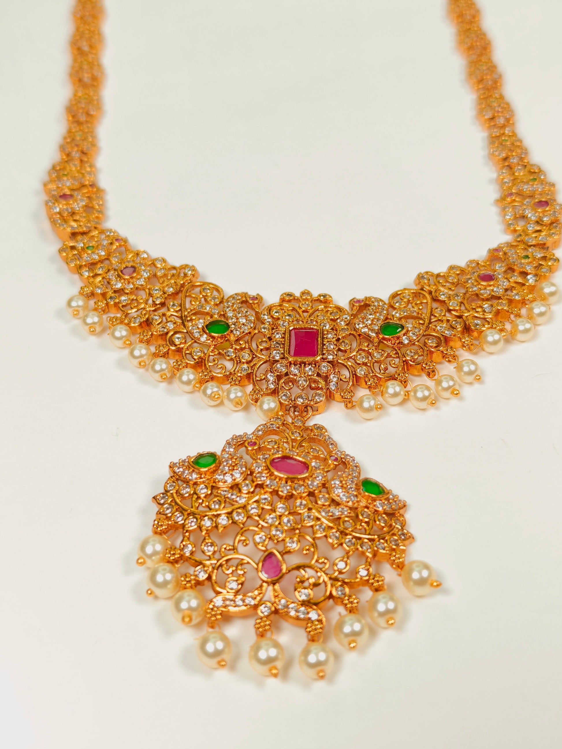 The Vandana Long Haram showcases a sophisticated gold-like finish, adorned with vibrant ruby and green stones paired elegantly with white pearls. Made from sturdy copper and alloy, this set includes matching earrings and a maangtika, offering a complete traditional look. Its detailed craftsmanship and rich embellishments make it an expert choice for enhancing festive and ceremonial attire.