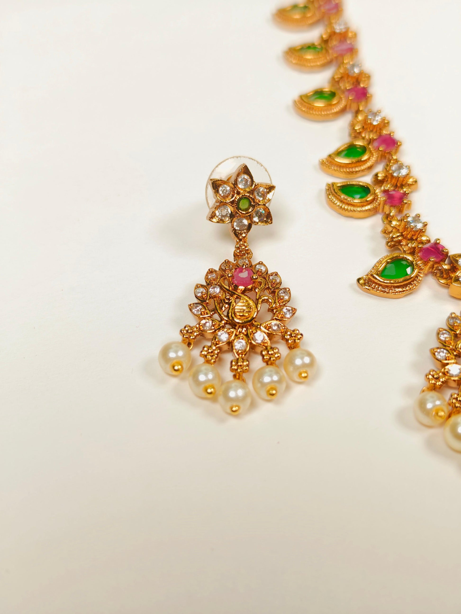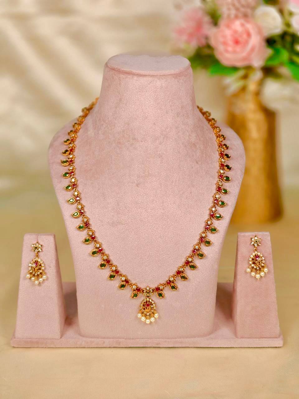 The Yashi Long Haram showcases expert craftsmanship with its gold-like finish on a sturdy copper and alloy base. Adorned with vibrant green and ruby stones alongside delicate pearl accents, this necklace offers a sophisticated blend of color and texture. Ideal for enhancing traditional attire, it delivers a luxurious appearance while maintaining durability and comfort.